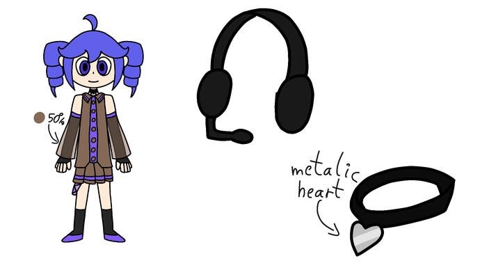 Her outfit has a dark orange-ish colour with purple trimmings and highlights. She wears purple slippers and black leg and arm warmers. Her slieves are made with transparent material with the same colour as her outfit. Usually she doesn't wear any headphones, but on stage she can be seen with black headphones. She wears a collar-like necklace around her neck. Her drill-shaped locks, ahoge, as well as the rest of her hair are in the dark blue-ish shade.